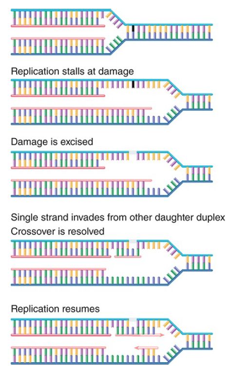 FIGURE 2. When replication halts at damaged DNA, the damaged sequence is excised and the complementary (newly synthesized) strand of the other daughter duplex crosses over to repair the gap. Replication can now resume, and the gaps are filled in.