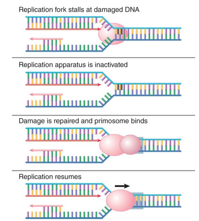 -After the damage has been repaired, the primosome is required to reinitiate replication by reinserting the replication complex.