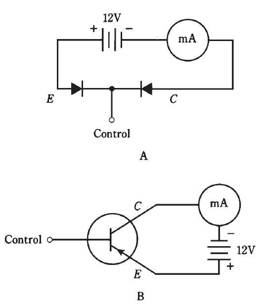 Fig. 1: At A, simple PNP circuit using dual-diode modeling. At B, the actual transistor circuit.