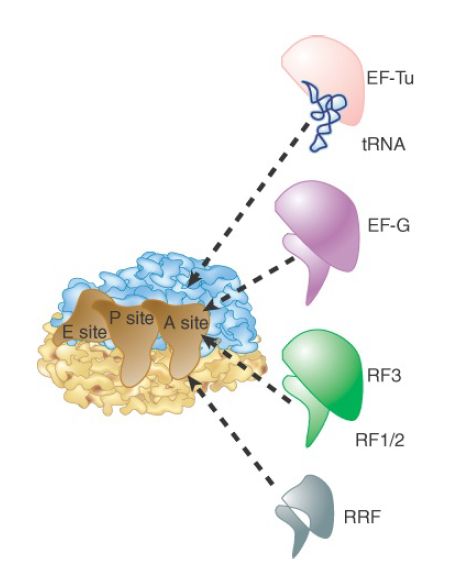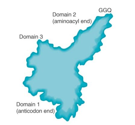 RF3 resembles the GTP-binding domains of EF-Tu and EF-G, and RF1 and RF2 resemble the C-terminal domain of EF-G, which mimics tRNA. This suggests that the release factors utilize the same site that is used by the elongation factors. Figure 1 illustrates the basic idea that these factors all have the same general shape and bind to the ribosome successively at the same