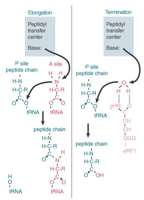 FIGURE 3. Peptide transfer and termination are similar reactions in which a base in the peptidyl transfer center triggers a transesterification reaction by attacking an N–H or O–H bond, releasing the N or O to attack the link to tRNA.