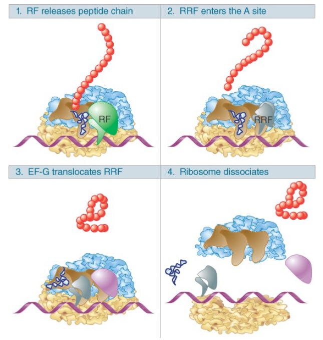 FIGURE 4. The RF (release factor) terminates translation by releasing the polypeptide chain. The RRF (ribosome recycling factor) releases the last tRNA, and EF-G releases RRF, causing the ribosome to dissociate.