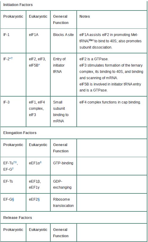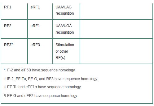 Table 1 compares the functional and sequence homologies of the prokaryotic and eukaryotic translation factors.