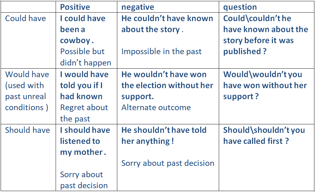 Today we will take a look at the modal verbs could have, would have and should have. These past tense modals are useful for expressing your present feelings about a past decision (or other action).