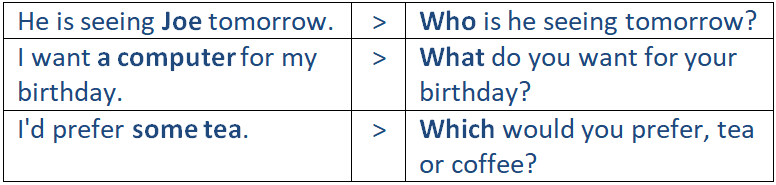 Wh-questions are questions which start with a word like what, when, where, which, who, whose, why and how.