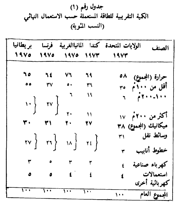 في الجدول رقم (1) نقدم قائمة بالاستهلاك النهائي من الطاقة في الدول الصناعية الغربية الرئيسية: