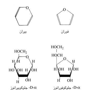 2- البنى الحلقية «البيرانوز» (Pyranose) والفيورانوز» (Furanose): اعتمدت هذه التسمية على حقيقة مغادها أن البئى الحلقية الثابتة لأحاديات السكريدات تكون مماثلة للبنى الحلقية إما للبيران أو إما للفيوران (الشكل 15-3). ويمكن للكيتوزات أن تكون بشكل حلقي أيضاً، مثل D- فركتو فيورانوز أو D -فركتو بيرانوز (الشكل 15-4). وفي حالة الجلوكوز. الموجود في الحلول، فإن أكثر من 99 % منه يكون على شكل بيرانوز.