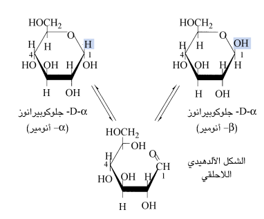 3 - الأنوميرات (Anomers) (المصاوغات الكربونيلية) ألفا وبيتا: إن البنية الحلقية للألدوز هي اسيتال نصغي (هيمي اسيتال Hemiacetal)، لأنها تتشكل باتحاد الدهيد مع زمرة كحولية (الشكل 15-5). وبشكل مماثل، فإن البنية الحلقية للكيتوز هي كيتال نصفي (هيمي كيتال: Hemiketal) (الشكل 15-4). أما الجلوكوز البلوري فهو D-الفا- جلوكوبيرانوز (الشكل 15-15). وتبقى البنية الحلقية على حالها في المحلول، لكن تحدث المصاوغة حول الموقع 1 ، أي عند زمرة الكربونيل أو ذرة الكربون الأنوميرية (Anomeric)، ويصبح المزيج مؤلفاً من α -جلوكوبيرانوز (38%) و β- جلوكوبيرانوز (62%). كما يكون قيمته أقل من 0.3 % من الأنوميرات ألفا وبيتا بالشكل المفتوح (غير الحلقي او صيغة هاورث). ويترافق هذا التوازن مع دوران بصري (التدوير المتبدل Mutarotation) وذلك عندما تتفتح حلقة الأسيتال النصفي ثم يعاد تشكلها مع حدوث تبدل في موضع الزمر (-H) و(-HO) على الكربون رقم 1. حيث يحدث هذا التبدل على الأرجح بوساطة الجزيء اللاحلقي ذو السلسلة المستقيمة المميهة، مع أن تخطيط الاستقطاب قد أشار إلى أن الجلوكوز يوجد بالشكل اللاحلقي بنسبة لا تتعدى 0.0025 % منه فقط. ويكون الدوران البصري للجلوكوز في المحلول من النمط المدور لليمين، لذلك غالبا ما يستخدم الاسم البديل له ((الدكستروز)) في التطبيقات السريرية.