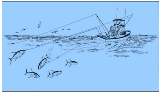 يتم السحب من الشصوص الحاوية على طعوم من مؤخرة مركب بطيء الحركة. ترتب الخيوط الحاملة للشصوص بطريقة تمنع تداخلها أثناء عملية السحب.