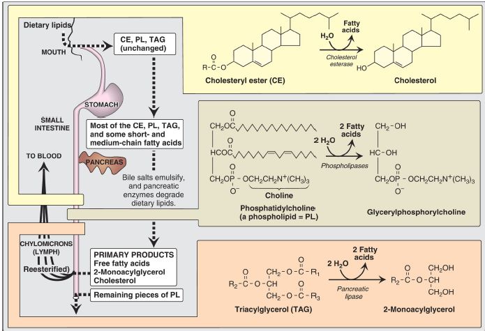 The average daily intake of lipids by U.S. adults is ~78 g, of which >90% is triacylglycerol ([TAG], formerly called triglyceride [TG]), that consists of three fatty acids (FA) esterified to a glycerol backbone . The remainder of the dietary lipids consists primarily of cholesterol, cholesteryl esters, phospholipids, and nonesterified (free) FA (FFA). The digestion of dietary lipids begins in the stomach and is completed in the small intestine. The process is summarized in Figure 1.