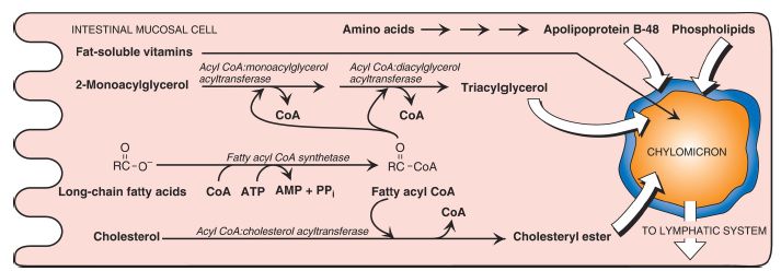 Figure 1: Assembly and secretion of chylomicrons by intestinal mucosal cells. [Note: Short- and medium-chain-length fatty acids do not require incorporation into chylomicrons and directly enter into the blood.] CoA = coenzyme A; AMP = adenosine monophosphate; PPi = pyrophosphate.