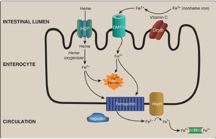 1. Absorption, storage, and transport: Intestinal uptake of heme is by a heme carrier protein (Fig. 29.8). Within the enterocytes, heme oxygenase releases Fe2+ from heme (see p. 282). Nonheme Fe is taken up via the apical membrane protein divalent metal ion transporter-1 (DMT-1).