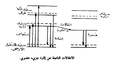 عن إثارة جزيء عضوي. كما قد تحدث انتقالات داخلية بين مستويات الإثارة المختلفة ثم يتبع ذلك عودة هذه الجزيئات إلى مستوى الاستقرار الأرضي. وفي هذه الحالة ينطلق ضوء طاقته أقل من سابقه ويعرف هذا التفاعل بتفاعل الفسفرة Phosphores. وذلك كما نبينه في الشكل (1). لاحظ هنا أن تفاعل الفسفر: يحدث بعد فترة زمنية من تفاعل الإضاءة. وبالتالي عندما تختار وامضاً مناسباً فيجب أن يتمتع بمقدرة كبيرة على تحويل طاقة الإشعاع الساقط إلى إضاءة لحظية بينما يجب أن يقل احتمال تفاعل الفسفرة.