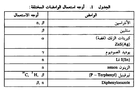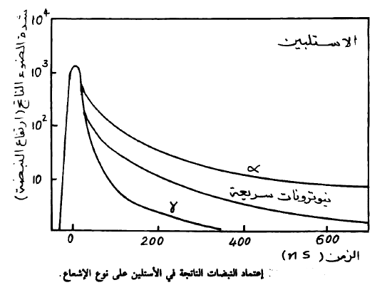 وكما ذكرنا سابقاً فإن هذه الكاشفات تمتاز بأنها سريعة. كما ونجد أيضاً أن زمن تحلل النبضات الناتجة عنها يعتمد على نوع الإشعاع الساقط عليها. وتستخدم هذه الميزة للتفريق بين أنواع هذه الإشعاعات المختلفة. نبين في الشكل (2) اعتماد النبضات الناتجة في الأستلبين على نوع الإشعاع. حيث