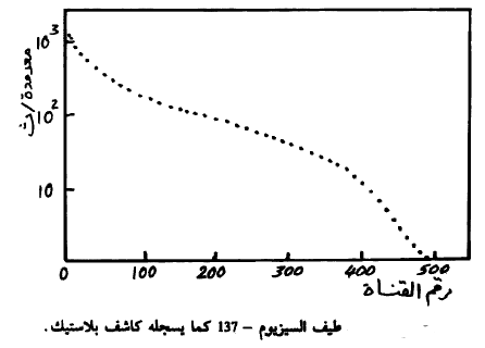 بلاستيك. قارن بين هذا الشكل وطيف الطاقة المجل لنفس العنصر المشع باستخدام كاشف يوديد الصوديوم. حيث تغيب قمة الطاقة الكاملة من الطيف المسجل بواسطة كاشف البلاستيك الذي يظهر فقط توزيع كمبتون.