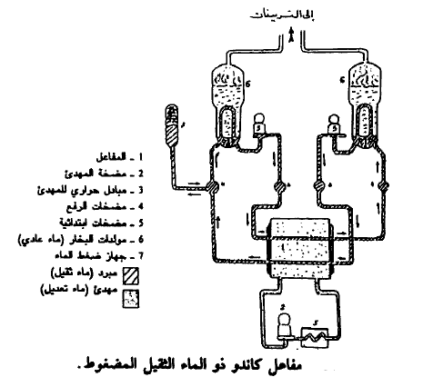 في الشكل (1) نبين مفاعل كاندو (CANDU) ذو الماء الثقيل المضغوط الذي ذكرناه آنفاً حيث يستخدم هنا الماء الثقيل D2O كمبرد ومهدئ. أما الوقود فهو عبارة عن اليورانيوم الطبيعي في صورة UO2 (بنسبة