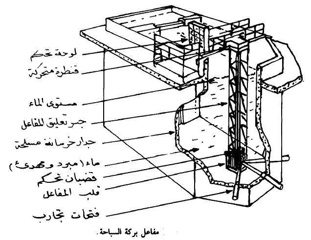 كما ويمكن استخدام الماء كمهدئ ومبرد في أمثال هذه المفاعلات. ومن أشهر المفاعلات التي تعمل وفق هذا المبدأ مفاعل بركة السباحة Swimming Pool Reactor الذي نبينه في الشكل (4). حيث يعلق القلب