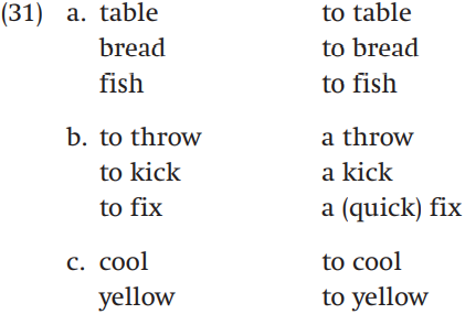 Although we often form new lexemes by affixation or compounding, in English it is also possible to form new lexemes merely by shifting the category or part of speech of an already existing lexeme without adding an affix. This means of word formation is often referred to as conversion or functional shift. In English, we often create new verbs from nouns, as the examples in (31a) show, but we also do the reverse (31b), and sometimes we can even create new verbs from adjectives (31c):