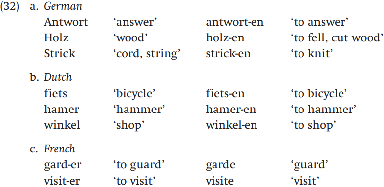 There may appear to be a suffix added in the derivation of the verbs in the examples in (32a–b) and one deleted in (32c). But the -en suffix in German and Dutch and the -er suffix in French do not derive the verbs per se – they are inflectional morphemes that signal the infinitive form of the verb. If we assume that conversion involves only the base or root, these examples count as conversion.