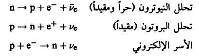 أما التفاعلات الثلاثة الأولى فبيناها بالتفصيل وهي خاصة بتحلل (β). يتضح من هذه التفاعلات الخاصة بتحلل β وتلك الخاصة بتحلل البايونات (معادلات 1، 2) أن هناك نوعان من النيوترينات أحدهما خاص بالإلكترونات وينطلق معها (في تحلل β، والآخر خاص بالميونات وينطلق معها (في تحلل البايونات) أما المعادلة (3) فتبين تحلل الميونات إلى الكترونات وينطلق نوعاً النيوترينات. فإذا كان هاذان النوعان متطابقان (Identical) فإن على أحدهما أن يتلاشى مع الآخر باعتبار أن أحدهما الجسيم والآخر ضديده، ومن ثم ينطلق إشعاع γ وبالتالي فإن التفاعل (3) يأخذ الشكل التالي: