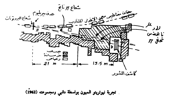 فينطلق من تحلل البايون (معادلتي 1،2) أو تحلل الميون (معادلة 3). لقد تم التأكد عملياً من وجود هاذين النوعين في تجربة استخدمت السينكروترون في بروكهافن بطاقة 30 ج.أ. ف. وذلك كما نبينه في الشكل (1) حيث يستخدم شعاع البروتونات الناتج عن المعجل بطاقة قدرها (15) ج. أ. ف. لقذف هدف من البيريليوم لإنتاج بايونات بطاقة قدرها (3) ج.أ.ف. ويتحلل حوالي 10% من هذه البايونات حسب العلاقتين (1 و2) وينتج عن ذلك الميونات والنيوترينات. وعلى بعد قدره (21) متراً من الهدف يوجد درع من الصلب سمكه (13.5) متراً يقوم بامتصاص البايونات