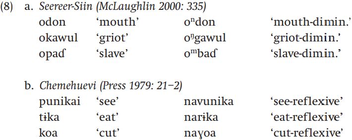 In (8a), in the West Atlantic language Seereer-Siin, some noun diminutives are formed by replacing the first stop consonant in the stem, for example [p, k, d] in the words in (8a), with the corresponding prenasalized stop ([mb, ŋ g, nd]). And in Chemehuevi, illustrated in (8b), the reflexive of a verb is formed by prefixing na- and changing the initial stop consonant of the root to a voiced continuant ([p] becomes [v], [t] becomes [r], and [k] becomes [ɣ]).