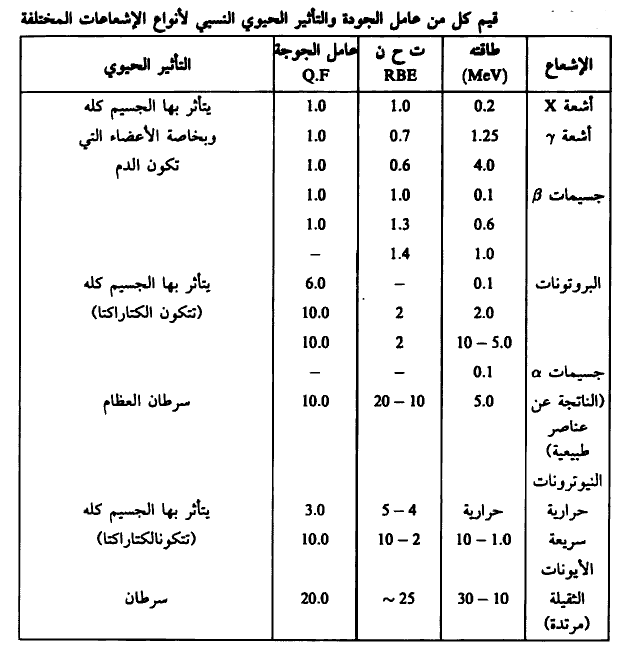 نبين في الجدول (1) قيم كل من عامل الجودة والتأثير الحيوي النسبي لأنواع الإشعاعات المختلفة؟
