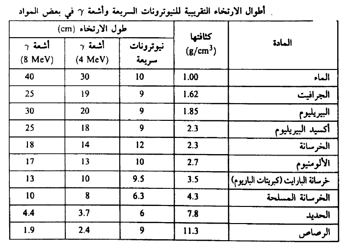 ومن ثم تعبر λ عن سمك المادة اللازم لإنقاص الفيض إلى 1eِِ من قيمته الأصلية. نبين في الجدول (1) أطوال الارتخاء التقريبية للنيوترونات السريعة وأشعة γ لبعض المواد.