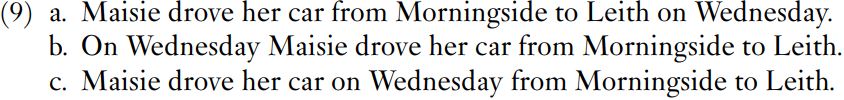 In (9a), the object her car is next to the verb, followed by the directional phrases from Morningside and to Leith. As discussed above, objects and directional phrases are complements. The time-when phrase on Wednesday is at the end of the clause in (9a) and at the beginning of the clause in (9b). In (9b), it is closer to drove, but this is not important. What is important is the fact that the adjunct does not come between the head and any of the complements. This does happen in (9c), where on Wednesday separates the complement her car from the other complement to Leith. Example (9c) is at the least awkward – although there might be contexts in which that order of phrases would be appropriate.