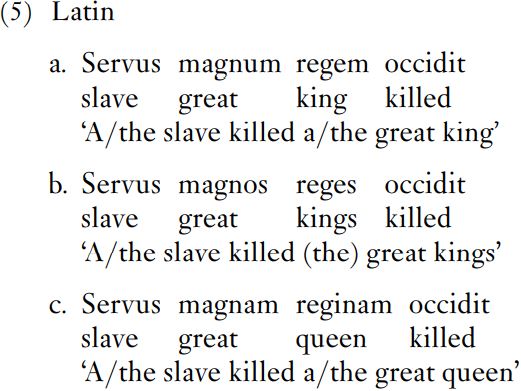 Occidit is a verb that requires an object in what is called the accusative case. In the examples in (5), occidit, in the traditional formula, governs its object noun in the accusative case; that is, it assigns accusative case to the stems reg- (king) and regin- (queen). Independently of the verb, these nouns are singular in (5a) and (5c) and plural in (5b). The combination of accusative and singular requires the choice of the suffixes -em or -am depending on the stem, and the choice of accusative and plural requires -es for the stem reg-. The properties ‘accusative’ and ‘singular’ or ‘accusative and plural’ are passed on to the adjective in the direct object noun phrase, magn-, and the appropriate suffix is chosen.