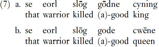 In (7b), the object noun cwe¯ne, with the suffix -e, is modified by the adjective go¯de, with the suffix -e. This contrasts with the subject noun cwe¯n in (3b) with no suffix and modified by the adjective go¯du, with the suffix -u. In (7a), the noun cyning has no suffix but the adjective does have a special suffix, namely -ne as in go¯dne. There is no contrast in the suffixes added to subject and object plural nouns.