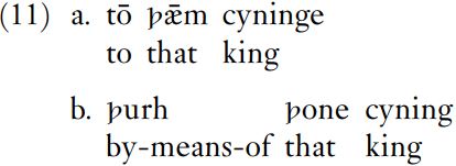 In (11a), †æ¯m is the dative form of se ‘that’ and cyninge has the dative suffix -e. In (11b), †one is the accusative form of se but cyning has no suffix.