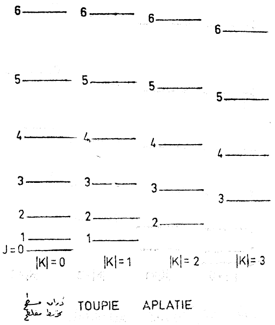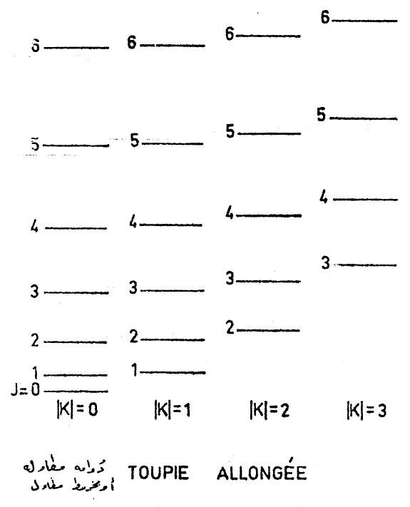 والشكلين (1) و (2) يعطيان مخططا سويات الطاقة الدورانية لجزيء، ذو تناظر محوري: وهما متعلقان في حالة المخروط المطاول والمخروط المسطح توزع سويات الطاقة بأعمدة توافق كل واحد لقيمة واحدة ل K.