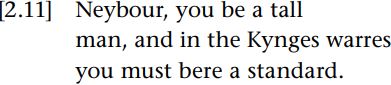 However, the area of radical change concerns the second person pronouns. Elizabethan English, for example, offered a choice between two sets of pronominal forms for the second person: the forms ye, you, your, yours and yourself (the you-forms), and the forms thou, thee, thy, thine and thyself (the thou-forms). In Old English, you generally used the first set for a plural referent and the second for a singular. But by Middle English the variant chosen could have significant social implications. These items had taken on a stronger social deictic role, rather than just personal. The usage of these sets is a matter of great controversy. Brown and Gilman (1960) predicted that high status social equals used you-forms to each other, low status social equals used thou-forms to each other, high status individuals used thou-forms to lower status, and low status individuals used you-forms to higher status. These predictions fi t the usage of Middle English reasonably well. One can see a certain similarity in the way you-forms and thou-forms were used in this period of English with the way, for example, tu and vous are used in today’s French or du and Sie in German. However, these predictions become more and more unreliable as we move towards the 17th century. The meanings of any particular usage had increasingly to be inferred from the specifics of context. Take this brief extract from the Merrie Tales of Skelton (1567) as an example. In this tale Skelton, a parson, tries to persuade a cobbler to go to war.