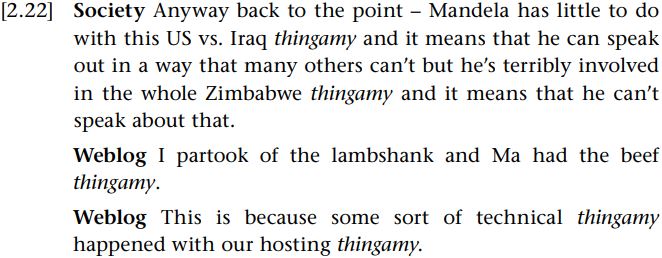 Why might we use such words? Consider these examples of recent usage of thingamy taken from the Oxford English Corpus: