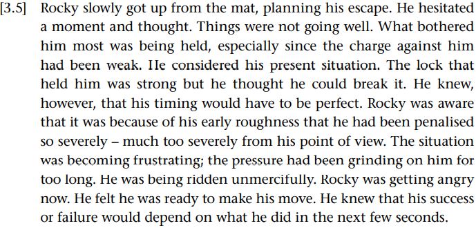 The key problem here is trying to work out the discourse topic. To begin with, who is Rocky? The text tells us about, for example, his spatial circumstances (he is on a mat and held by the lock), his goal (planning his escape), his evaluation of the situation (things were not going well), his history (his early roughness, the pressure had been grinding on him for too long), his evaluation of his plan to achieve his goal. (He felt he was ready to make his move. He knew that his success or failure would depend on what he did in the next few seconds.) We also, of course, learn that Rocky is his name, connoting that he is male (and quite possibly North American rather than British). But the text does not actually tell us who Rocky is or even where he is. Note that many of the clues are in referring expressions, especially definite noun phrases (Rocky, the mat, his escape, the charge, his present situation, the lock and so on). We discussed this very