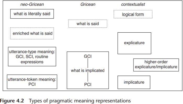 While Grice started with an initial distinction between what is said and what is implicated, both neo-Gricean and contextualist approaches to pragmatic meaning have proposed more nuanced and layered understandings of meaning representations, as summarized in Figure 4.2.