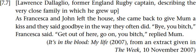 Here, in the direct speech, we see a conventionalized insulting vocative, you bitch, and also a conventionalized dismissal, get out of here. McEnery (2006: 39, 236) provides corpus evidence that there is a strong tendency in British English for bitch to be used between women, as here. Nevertheless, these items project contexts that are dramatically at odds with the situation within which they are uttered. Rather than antagonistic relationships, hate, coercion and so on, we have a strong loving family unit (Francesca has just demonstrated her affection by giving her mother a kiss). The recontextualisation of impoliteness formulae in socially opposite contexts reinforces socially opposite effects, namely, affectionate, intimate bonds amongst individuals and the identity of that group. Here we have the opposite of genuine impoliteness, that is, mock impoliteness, which consists of impolite forms whose effects are (at least theoretically for the most part) cancelled by the context (the term “mock impoliteness” is used in Leech 1983). Banter is a key everyday label (at least in English), though most types of teasing and some jokes and types of insults also have in common the fact that they involve mock impoliteness. One of the lacunae in Brown and Levinson (1987) is that they do not treat banter at all; in contrast, Leech (1983: 144) describes mock impoliteness within his Banter Principle: