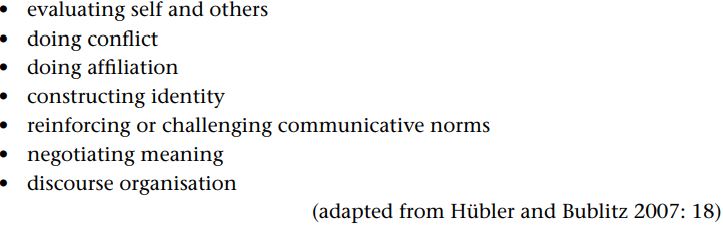 Metapragmatic awareness lies at the core of a number of important pragmatic phenomena. In many instances, this reflexive awareness is not always accessible or highly salient to participants. It may be inherent to their use of language, but it is not necessarily something they can articulate. There are, however, cases where metapragmatic awareness itself may become highly salient in discourse. The most obvious example of this is the use of metapragmatic commentary to “influence and negotiate how an utterance is or should have been heard, or [to] try to modify the values attributed to it” (Jaworskiń et al. 2004: 4); in other words, the strategic deployment of comments about language use in order to (re)negotiate interpretations of pragmatic meanings, pragmatic acts, and interpersonal relations, attitudes and evaluations. Hübler and Bublitz (2007) term such phenomena “metapragmatics in use”. They list some of the functions of metapragmatic commentary, including: