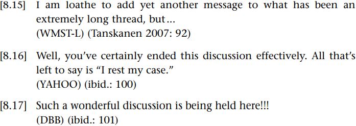 In a study of metapragmatic utterances that arise in computer-mediated interactions in a number of different mailing lists, for instance, Tanskanen (2007) illustrates how participants can use metapragmatic utterances to accomplish assessments of the degree of appropriateness of either their own or others’ posts, or to clarify their own contributions where some misunderstanding is perceived. Such comments were thus found to be designed to (1) accomplish judgements of appropriateness (see example [8.15]), (2) control and plan subsequent interaction (example [8.16]), or (3) give feedback on ongoing interaction (example [8.17]):