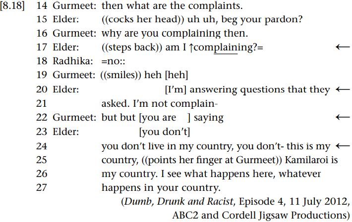 While the elder’s initial response in line 15 is indicative not only of possible forthcoming disagreement with what is supposed through Gurmeet’s question (i.e. that the elder has been complaining), but also that there is some issue in regards to the propriety of Gurmeet’s question. Gurmeet nevertheless repeats essentially the same question in line 16. This time the elder’s offence at the terms of the question becomes more evident in her rising pitch, stepping backwards and formulation of a “rhetorical question” in line 17. She then attempts to reformulate her prior turns as simply answering questions rather than complaining (lines 20–21), and then finally makes explicit what appears to be the source of the offence she is taking at Gurmeet’s line of questioning, namely, his implicit assumption that he has the right to judge the situation of “her” country (lines 24–27).3