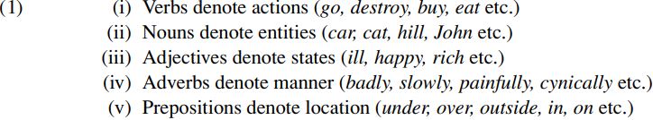 In §1.2, we noted that words are assigned to grammatical categories in traditional grammar on the basis of their shared semantic, morphological and syntactic properties. The kind of semantic criteria (sometimes called ‘notional’ criteria) used to categorise words in traditional grammar are illustrated in much-simplified form below: