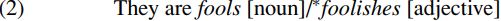 The morphological criteria for categorizing words concern their inflectional and derivational properties. Inflectional properties relate to different forms of the same word (e.g. the plural form of a noun like cat is formed by adding the plural inflection -s to give the form cats); derivational properties relate to the processes by which a word can be used to form a different kind of word by the addition of an affix of some kind (e.g. by adding the suffix -ness to the adjective sad we can form the noun sadness). Although English has a highly impoverished system of inflectional morphology, there are nonetheless two major categories of word which have distinctive inflectional properties – namely nouns and verbs. We can identify the class of nouns in terms of the fact that they generally inflect for number, and thus have distinct singular and plural forms – cf. pairs such as dog/dogs, man/men, ox/oxen etc. Accordingly, we can differentiate a noun like fool from an adjective like foolish by virtue of the fact that only (regular, countable) nouns like fool – not adjectives like foolish – can carry the noun plural inflection -s: