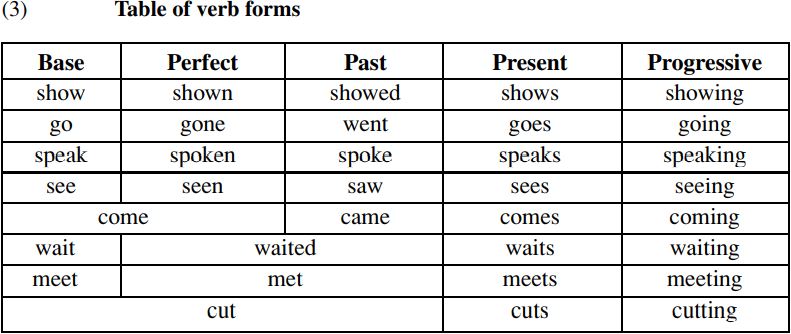 In much the same way, we can identify verbs by their inflectional morphology in English. In addition to their uninflected base form (= the citation form under which they are listed in dictionaries), verbs typically have up to four different inflected forms, formed by adding one of four inflections to the appropriate stem form: the relevant inflections are the perfect/passive participle suffix -n, the past-tense suffix -d, the third-person-singular present-tense suffix -s, and the progressive participle/gerund suffix -ing. Like most morphological criteria, however, this one is complicated by the irregular and impoverished nature of English inflectional morphology; for example, many verbs have irregular past or perfect forms, and in some cases either or both of these forms may not in fact be distinct from the (uninflected) base form, so that a single form may serve two or three functions (thereby neutralizing or syncretizing the relevant distinctions), as the table (3) below illustrates: