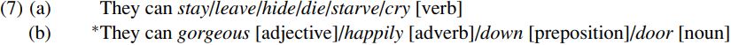 Using the same type of syntactic evidence, we could argue that only a verb (in its infinitive/base form) can occur in the position marked — in (6) below to form a complete (non-elliptical) sentence: