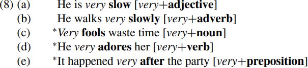 And the only category of word which can occur after very (in the sense of extremely) is an adjective or adverb, as we see from (8) below: