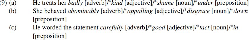Moreover, we can differentiate adjectives from adverbs in syntactic terms. For example, only adverbs can be used to end sentences such as He treats her —, She behaved —, He worded the statement —: