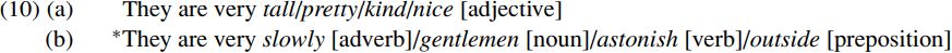 And since adjectives (but not adverbs) can serve as the complement of the verb be (i.e. can be used after be), we can delimit the class of (gradable) adjectives uniquely by saying that only adjectives can be used to complete a four-word sentence of the form They are very —: