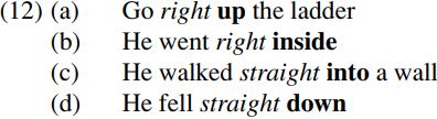 It should be noted, however, that since right/straight serve to intensify the meaning of a preposition, they can only be combined with those (uses of) prepositions which express the kind of meaning which can be intensified in the appropriate way (so that He made right/straight for the exit is OK, but ∗He bought a present right/straight for Mary is not).
