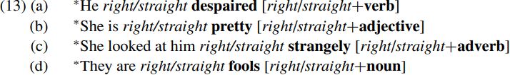 By contrast, other categories cannot be intensified by right/straight (in Standard English):
